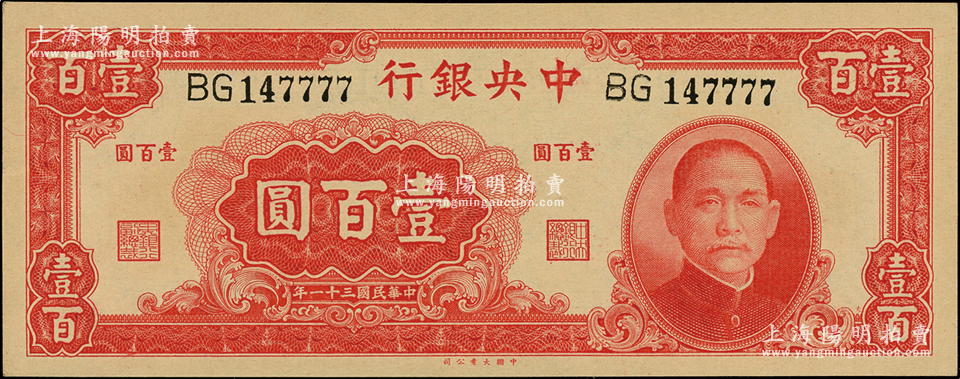 民国三十一年(1942年)中央银行大业版壹百圆,双字轨,且尾号为7777狮子号;源于前辈名家之遗藏,全新