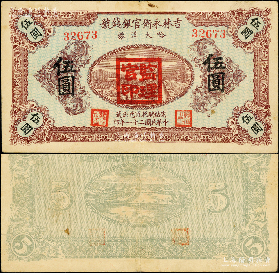 民国二十一年(1932年)吉林永衡官银钱号哈大洋券伍圆,盖有“监理官印”,乃属东北义勇军李杜所发行,少见,八成新