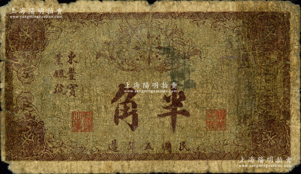 民国五年(1916年)东丰实业银号半角,背印告白文字;东丰县,原属奉天海龙府,今归吉林省辖;源于森本勇先生之旧藏,少见,六成新