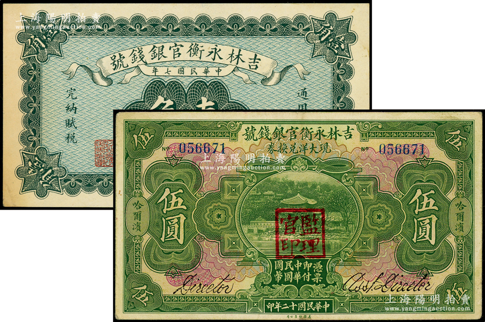 吉林永衡官银钱号纸币2种,详分:1918年绿色壹角;1923年现大洋兑换券伍圆,哈尔滨地名,盖有“监理官印”;海外藏家出品,九成新
