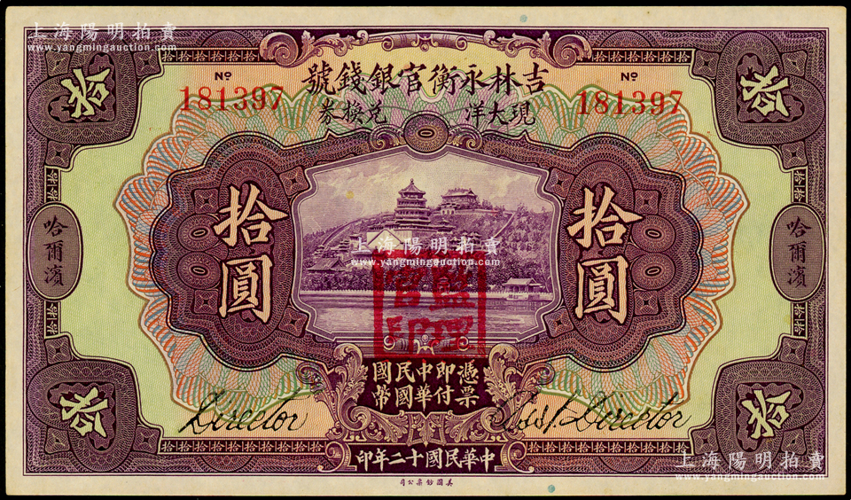 民国十二年(1923年)吉林永衡官银钱号现大洋兑换券拾圆,哈尔滨地名,盖有“监理官印”;海外藏家出品,九八成新