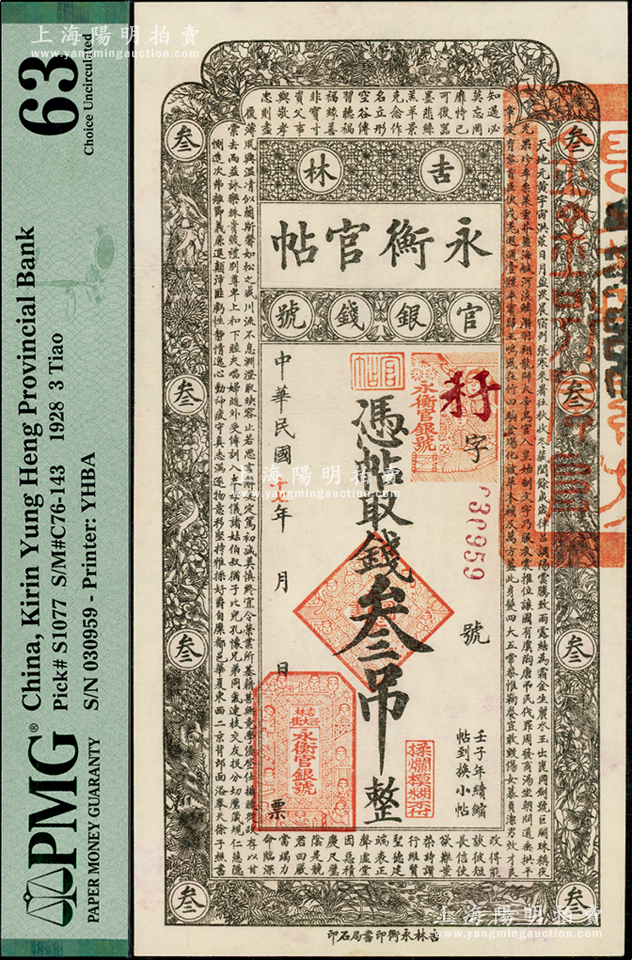 民国十七年(1928年)吉林永衡官帖叁吊,PMG 63 UNC