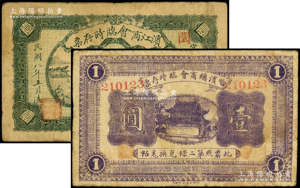 民国八年(1919年)滨江商会临时存票壹圆、哈滨总商会临时存票壹圆共2枚不同,原票七成新