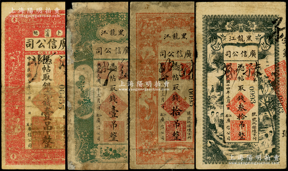 黑龙江广信公司纸币4种,详分:1918年银元钱壹吊,1919年壹吊、拾吊,1925年叁拾吊;英国奥斯汀先生藏品,其中1枚有修补,六至七成新