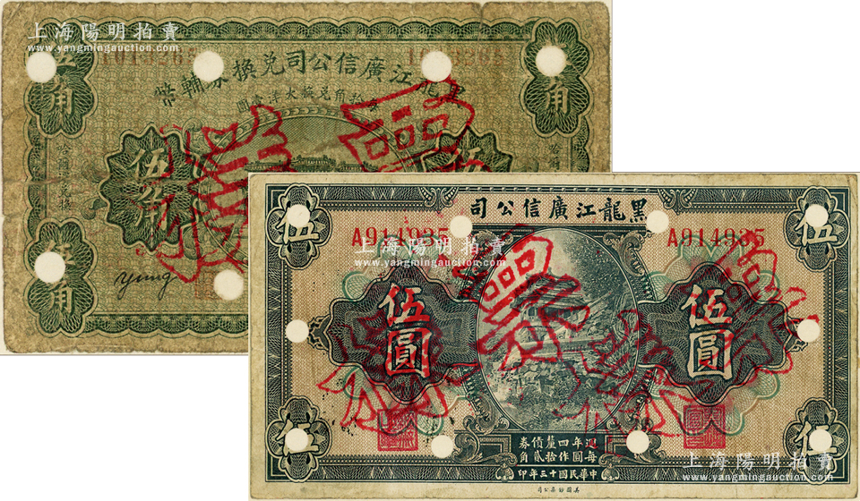 黑龙江广信公司纸币2种,详分:1920年兑换券辅币伍角(黑河发)、1924年週年四厘债券伍圆,均属正票改票样,且均张贴于档案册纸上,七至七五成新,敬请预览
