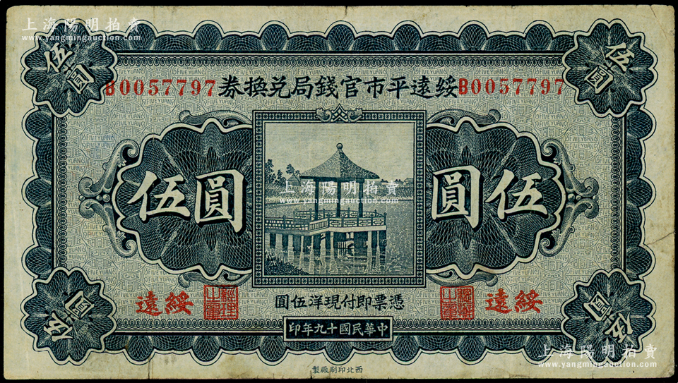 民国十九年(1930年)绥远平市官钱局兑换券伍圆,绥远地名,西北印刷厂制;海外藏家出品,近八成新