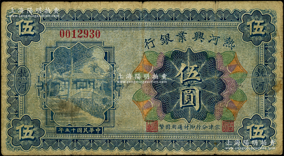 民国十五年(1926年)热河兴业银行伍圆,热河地名,京津分行即付通用国币;此券一般所见均为改造成“民国十八年版”的汇兑券,未改原票甚属少见;海外藏家出品,少见,原票七成新