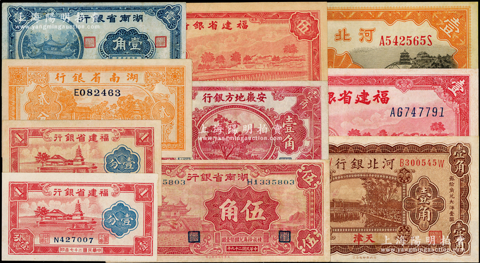 省钞10枚,详分:河北银行1929年天津壹角,1934年天津壹圆;湖南省银行1938年贰分,1940年壹角、伍角;安徽地方银行果树图壹角;福建省银行1938年壹分2枚,1939年壹圆,1941年伍角;八至九五成新,敬请预览