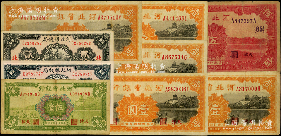 河北省钞共9枚,详分:河北省银行1934年伍角、壹圆5枚、伍圆领券{85};河北银钱局1936年北平贰拾枚2张;英国奥斯汀先生藏品,七至九成新