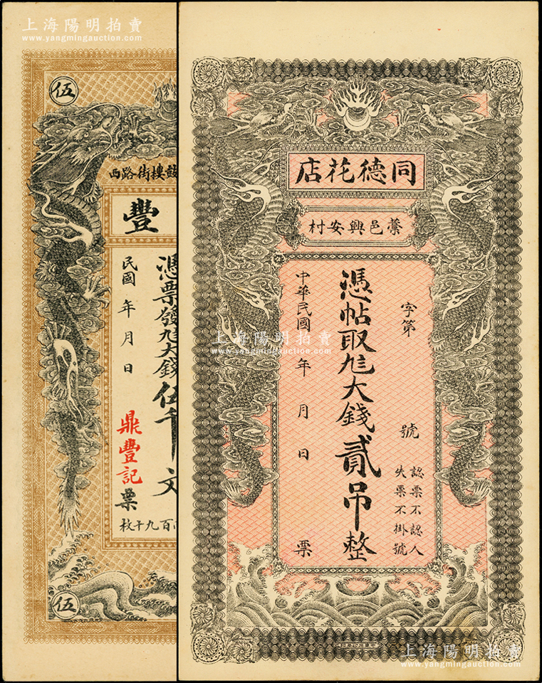 民国“双龙图”钱票2种,详分:(藁城)同德花店大钱贰吊,上印双龙戏珠图,背印聚宝盆;(郓城)鼎丰大钱伍千文,上印双龙戏珠图,背印万古长春牌坊和济南大明湖北极庙;资深藏家出品,形制美观,未折九至九五成新