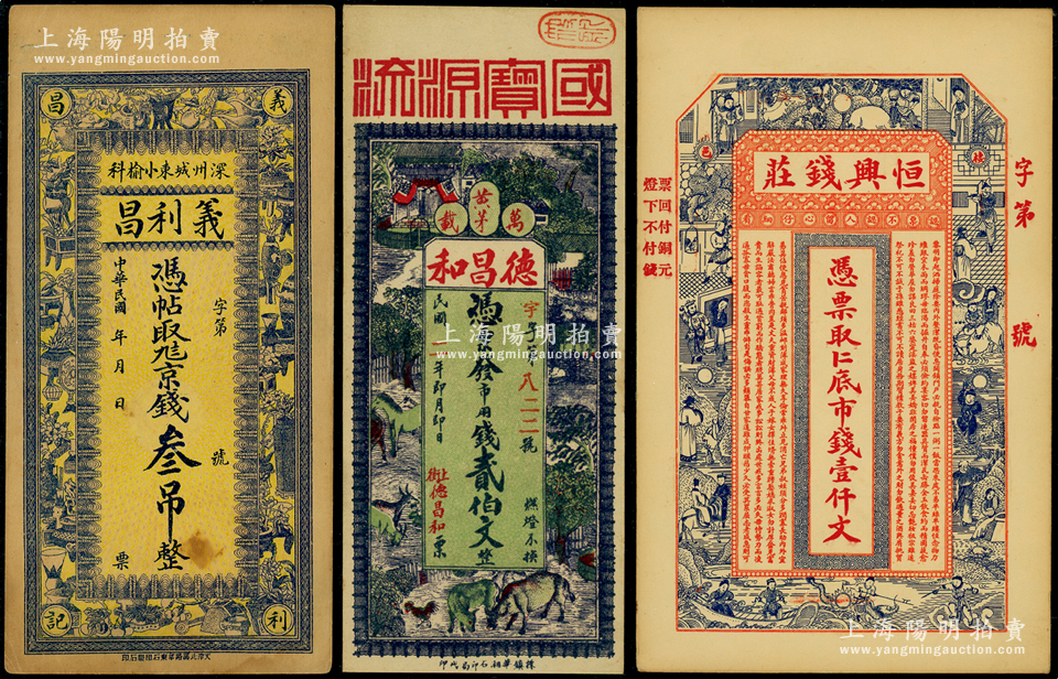 民国钱庄钞票3种,详分:(深州)义利昌京钱叁吊,(棲邑)恒兴钱庄市钱壹仟文,(万载)1913年德和昌市用钱贰伯文,其上图案均极富传统色彩;海外藏家出品,九至九五成新