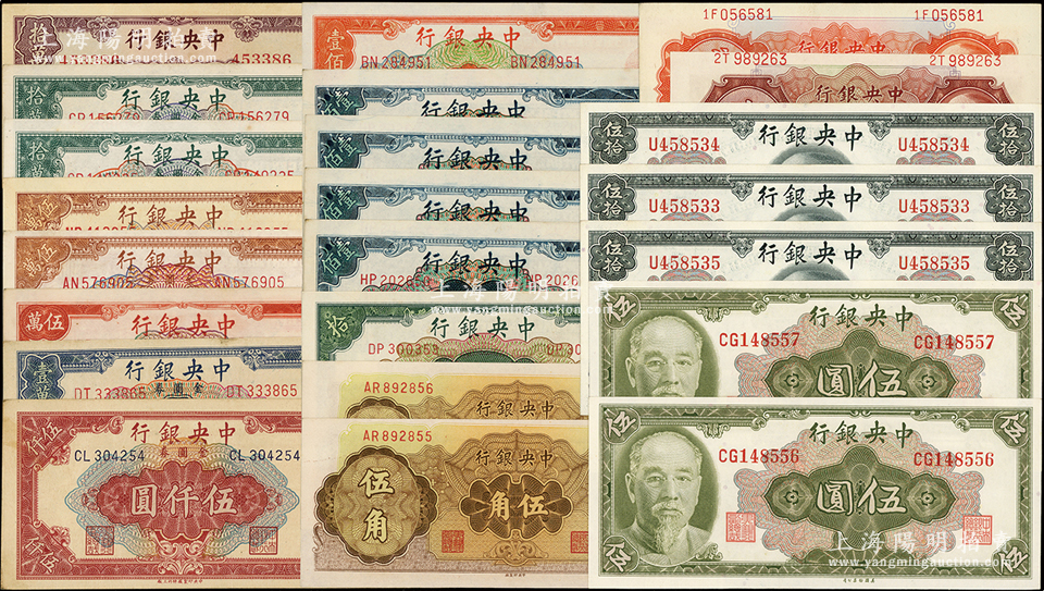 中央银行金圆券共23枚,详分:美钞版1945年伍圆2枚连号、蒋像伍拾圆3枚连号;德纳罗版1946年壹角、贰角;中央厂1948年伍角2枚连号、拾圆、蓝壹佰圆4枚连号,1949年桔壹佰圆、特约三厂伍仟圆、壹万圆、红伍万圆、棕伍万圆、特约二厂伍万圆、拾万圆2枚;中华版1949年拾万圆;源于前辈名家之遗藏,九成至全新