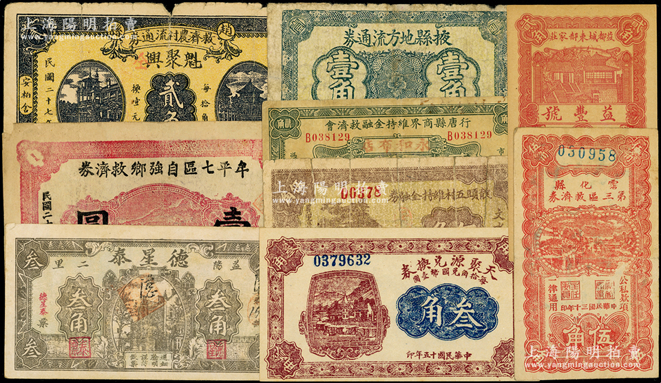 民国地方钱票9种,详分:行唐县商界维持金融救济券1933年贰角;赵县救济农村流通券1938年(魁聚兴)贰角;(益都)益丰号1932年贰角;牟平七区自强乡救济券1940年壹圆;掖县地方流通券壹角;沾化县第三区救济券1941年伍角;(文水)天聚源1926年叁角;文水县靛头五村维持金融券1937年伍角;(益阳)德星泰叁角;六至九五成新,敬请预览