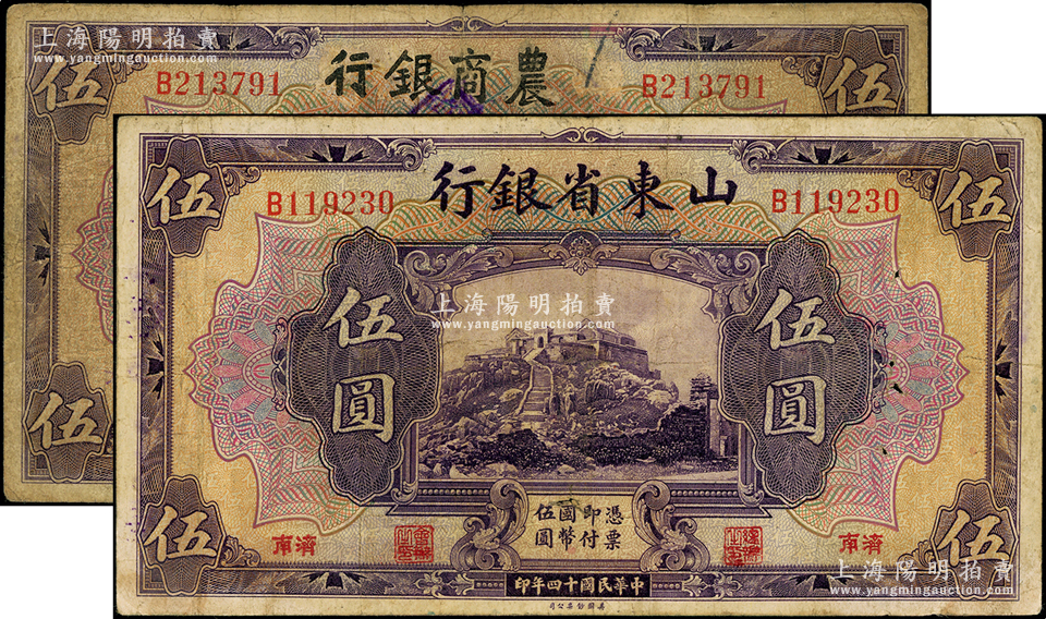 民国十四年(1925年)山东省银行美钞版伍圆,济南地名;另附农商银行1925年上海伍圆,属历史同时期山东省银行伍圆之伪改票;七成新