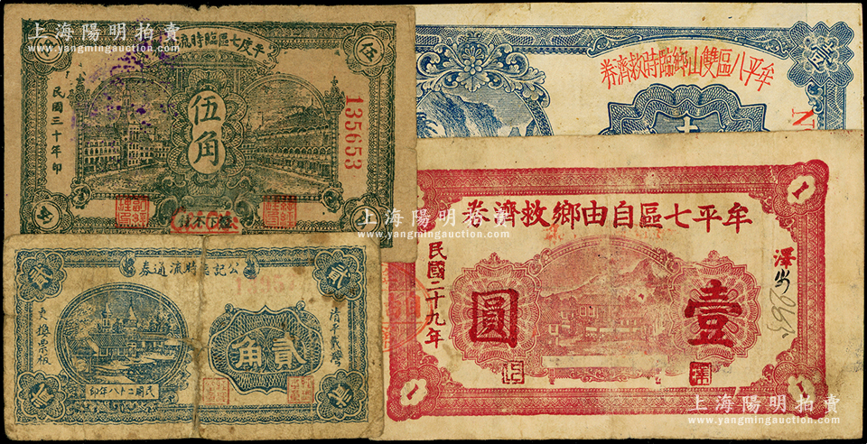 抗战时期山东地方流通券4种,详分:牟平七区自由乡救济券1940年壹圆,牟平八区双山乡临时救济券1941年壹圆,平度七区临时流通券1941年伍角,(清平)公记临时流通券1939年贰角,七至八成新,敬请预览