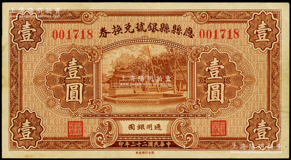 民国二十三年(1934年)应县县银号兑换券壹圆,少见,且属难得之上佳品相,八至八五成新