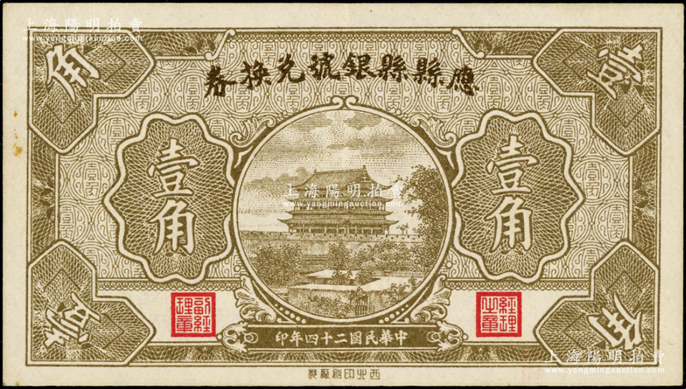 民国二十四年(1935年)应县县银号兑换券壹角,海外藏家出品,九成新