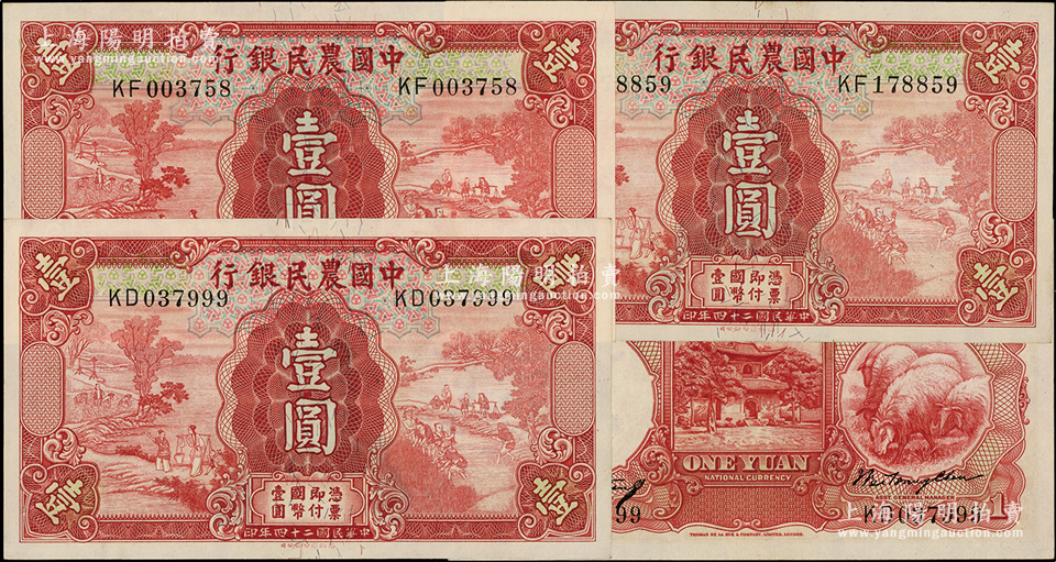 民国二十四年(1935年)中国农民银行德纳罗版壹圆3枚不同,双字轨,其中1枚尾号为999豹子号;源于前辈名家之遗藏,九八至全新
