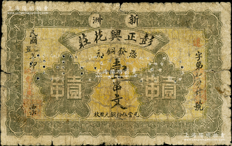 民国乙丑年(1925年)彭正兴花庄铜元壹串文,新洲地名(旧属湖北黄冈县,今属武汉市),背印古塔图;江南藏家出品,少见,六成新