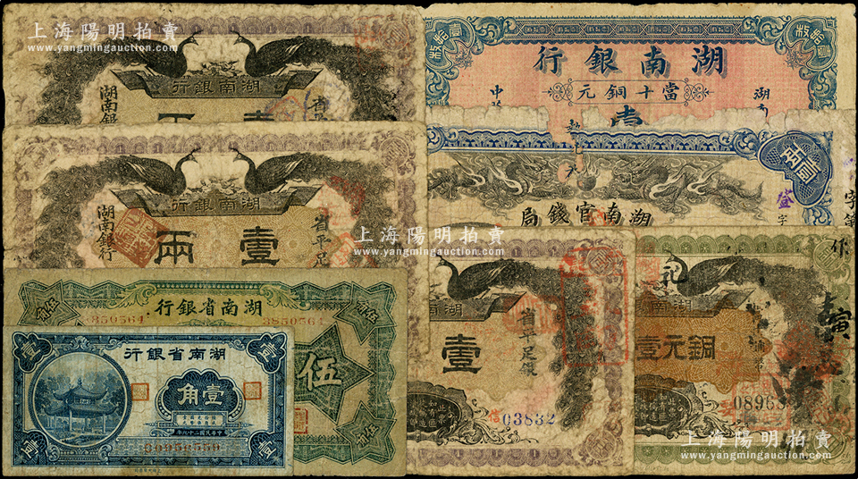 湖南省钞8枚,详分:光绪三十四年(1908年)湖南官钱局壹两;湖南银行1912年铜元壹百枚、壹两3张,1915年壹拾枚;湖南省银行1935年绿色伍角、1940年壹角;破损品至七成新,敬请预览