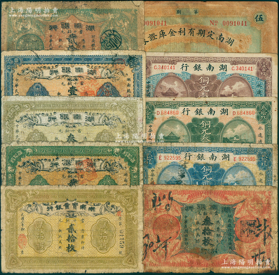 湖南纸币10种,详分:湖南实业银行1913年当十铜元贰拾枚;湖南银行1913年贰拾枚、叁拾枚、壹伯枚,1915年贰拾枚、叁拾枚,1917年贰拾枚、叁拾枚、壹百枚;湖南定期有利金库证券1920年伍圆;英国奥斯汀先生藏品,六至七五成新