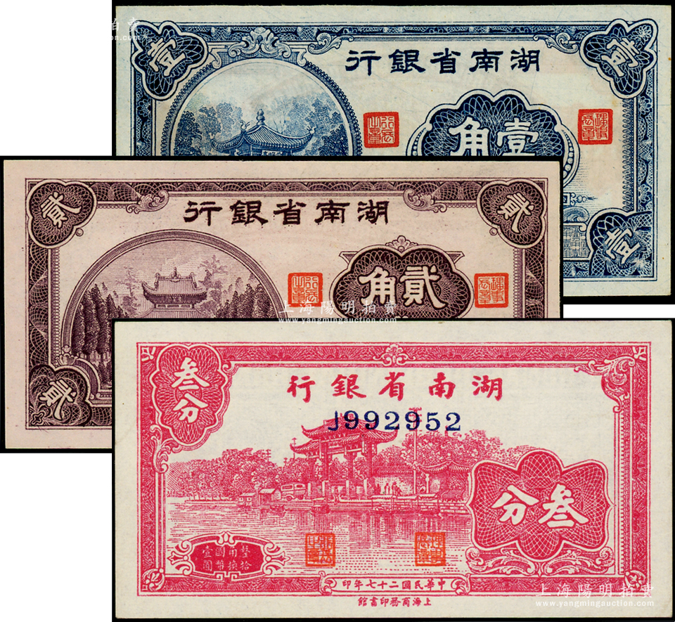 湖南省银行纸币3种,详分:1938年商务版叁分,1940年大东版壹角、贰角;海外藏家出品,上佳品相,九八至全新