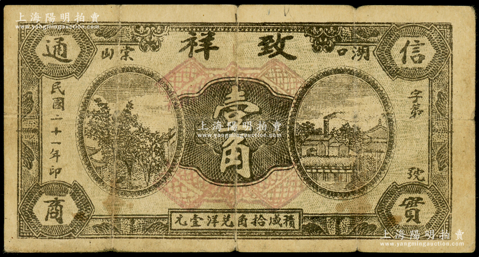 民国二十一年(1932年)致祥壹角,江西湖口县民间钞票,该号为花绒行;海外藏家出品,该县纸币存世稀见,原票七成新