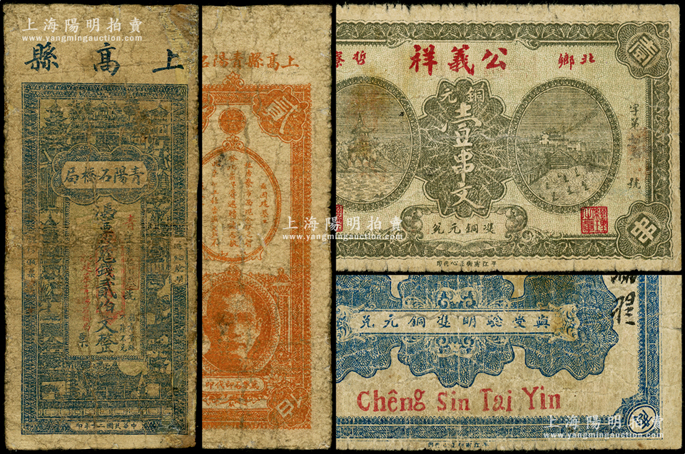 江西钱票2种,详分:(平江)公义祥铜圆壹串文;青阳石桥局1931年贰伯文,上印塔亭房屋,背印孙中山像;其中1枚有修补,六至七成新