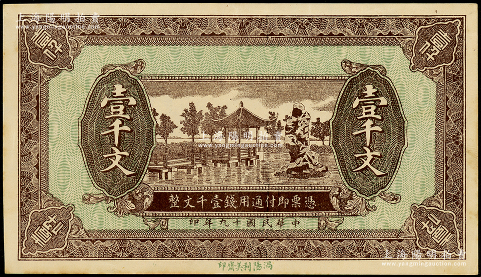 民国十九年(1930年)安徽“涡阳利美斋印”无名称壹千文钱票,上印杭州西湖九曲桥开网亭,形制美观,或属安徽亳州地区之钱票,海外回流品,九成新