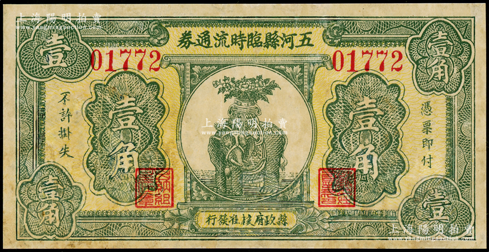 民国二十三年(1934年)五河县临时流通券壹角,由县政府核准发行,上印太平有象图,诚属安徽民间钞票之精品,极富传统吉祥色彩,有修补,七五成新