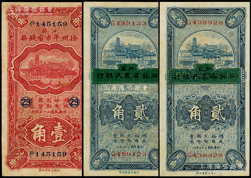 江苏纸币3枚,详分:江苏徐州平市官钱局1933年壹角,加印领券“29”字;江苏徐州平市官钱局改江苏省农民银行1933年贰角2枚;八至九成新