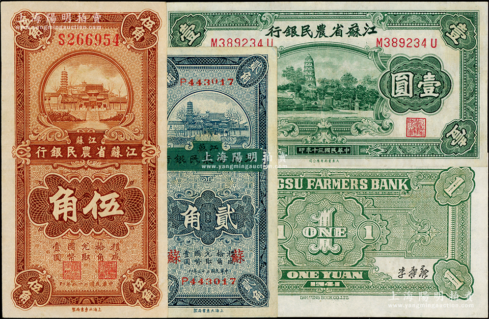 江苏纸币3种,详分:徐州平市官钱局改江苏省农民银行1933年贰角,加印“苏”字;江苏省农民银行1936年大东版伍角,1941年大东版壹圆;九至九五成新
