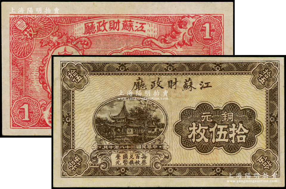 民国二十八年(1939年)江苏财政厅铜元壹枚、拾伍枚共2张不同,九至九五成新