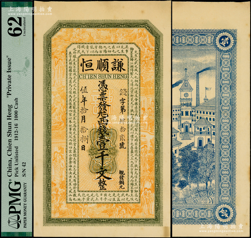 民国伍年(1916年)谦顺恒西钱壹仟文,风格属江苏海州发行,上印八仙、红楼梦仕女和范仲淹《严先生祠堂记》古文,背印江海关,图案精致;源于森本勇先生之旧藏,罕见,九五成新