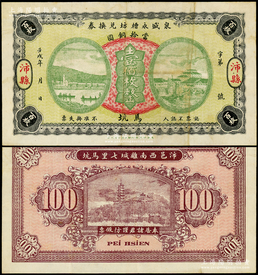 壬戌年(1922年)泉盛永槽坊兑换券当拾铜圆壹佰枚,江苏徐州府沛县民间钞票,上海代印,背印镇江金山寺塔,票幅宏大,图案美观;海外回流品,罕见,八成新