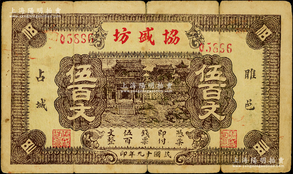 民国十九年(1930年)协盛坊伍百文,江苏雎宁县钱庄钞票,上印村落图;海外藏家出品,罕见,原票七成新