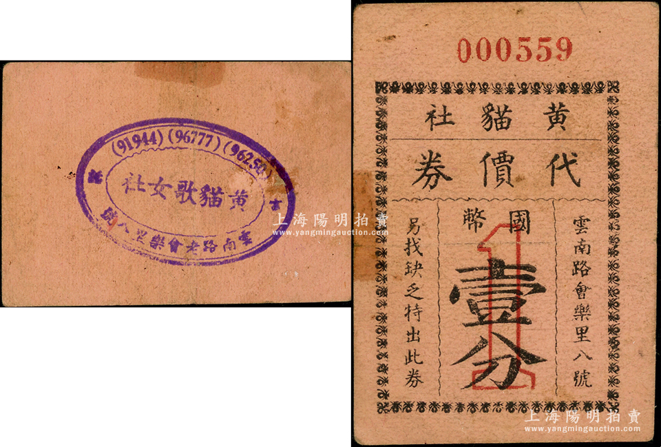 老上海孤岛时期(云南路会乐里)黄猫社代价券国币壹分,背盖“黄猫歌女社”戳记,昔年属应召女郎行业,可视为轿饭票之延续;源于馨悟堂之旧藏,目前存世仅见3枚,近八成新