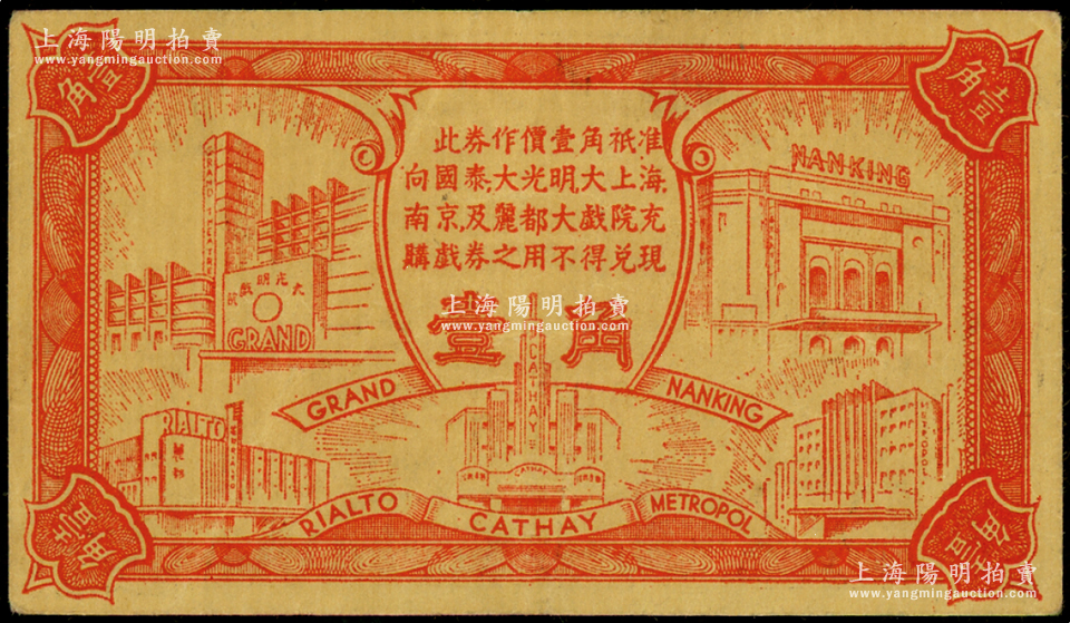 民国(上海)亚洲影业公司代价券壹角,可向“国泰、大光明、大上海、南京及丽都大戏院”使用,发行于孤岛时期,八成新