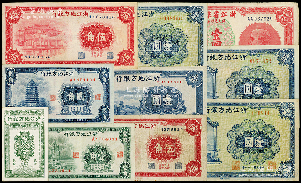 浙江省钞10枚,详分:浙江地方银行竖式贰分,1936年壹角、贰角、伍角2枚,1939年壹圆3枚,1941年壹圆;浙江省银行银元券1949年壹圆;七至九成新,敬请预览
