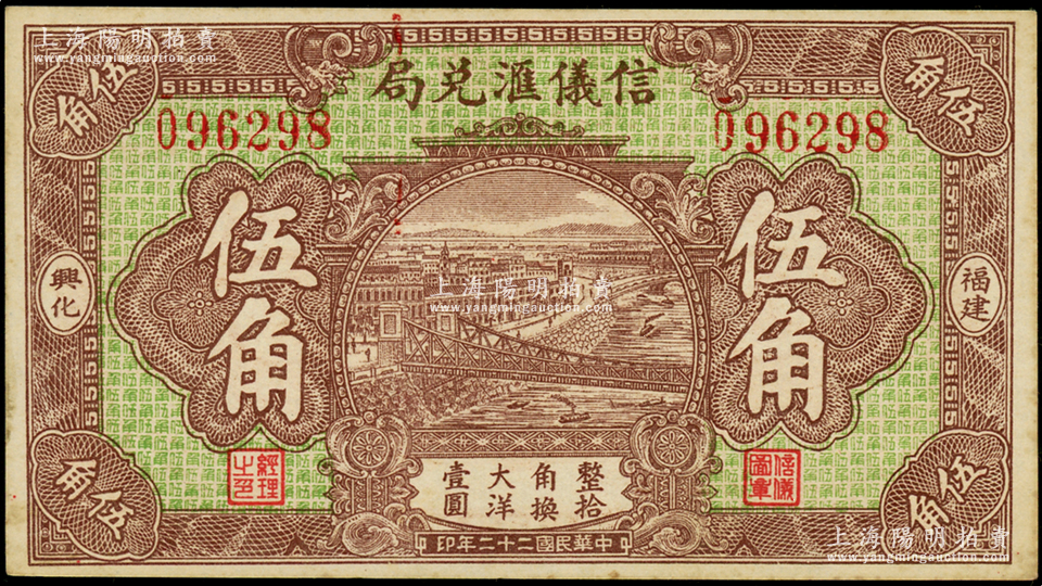 民国二十二年(1933年)信仪汇兑局大洋伍角,福建兴化侨汇业钞票,背印五枚小银币图,未折近九成新