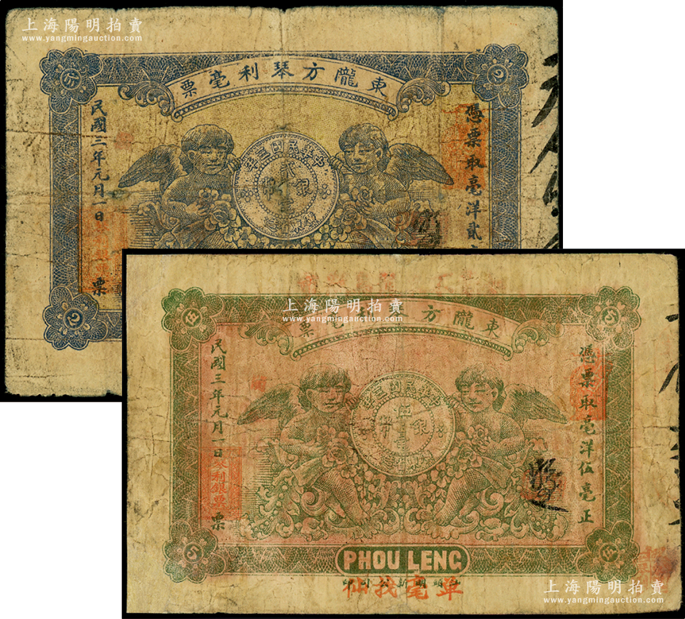民国三年(1914年)东陇方琴利毫票毫洋贰毫、伍毫共2枚不同,广东潮汕地区惠来县钱庄钞票,均上印二小天使和银币图,少见,其中1枚有修补,七成新,敬请预览