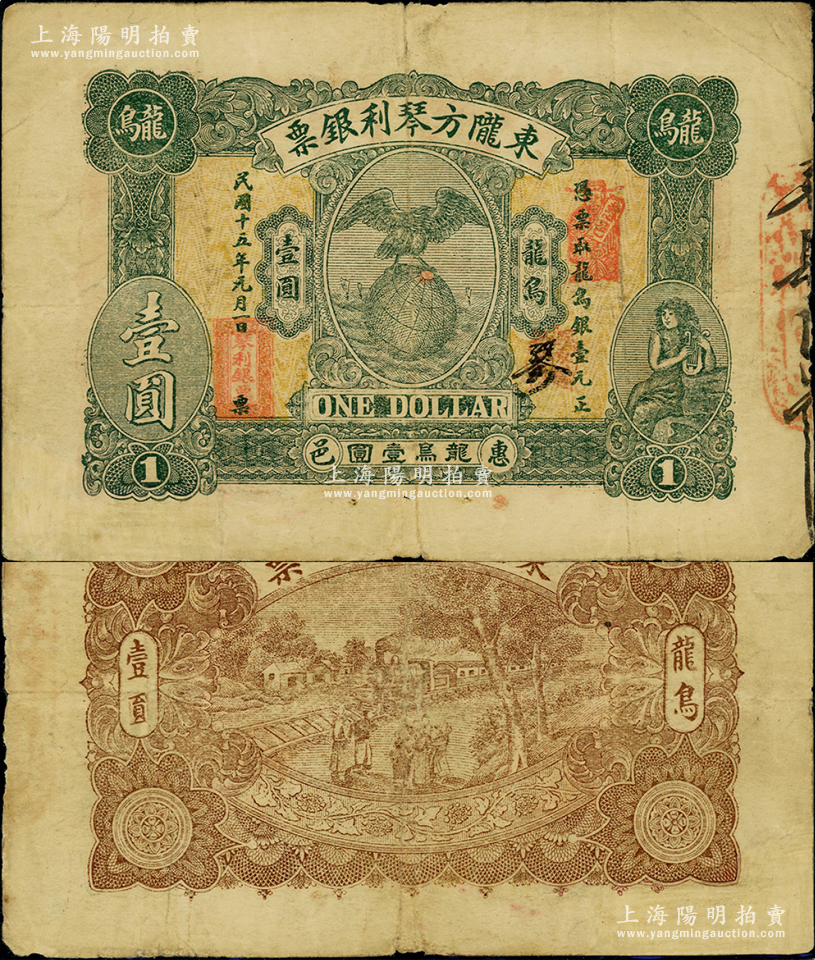 民国十五年(1926年)东陇方琴利银票龙鸟壹圆,广东潮汕地区惠来县钱庄钞票,上印鹰立地球和持琴少女图,背印乡村火车,少见,近八成新