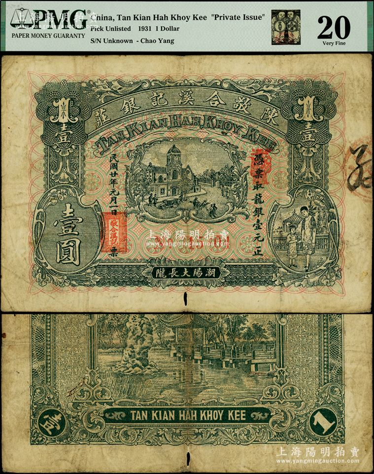 民国廿年(1931年)陈敬合溪记银庄龙银壹圆,广东潮汕地区潮阳县钱庄钞票,背印西湖九曲桥开网亭,罕见,七五成新