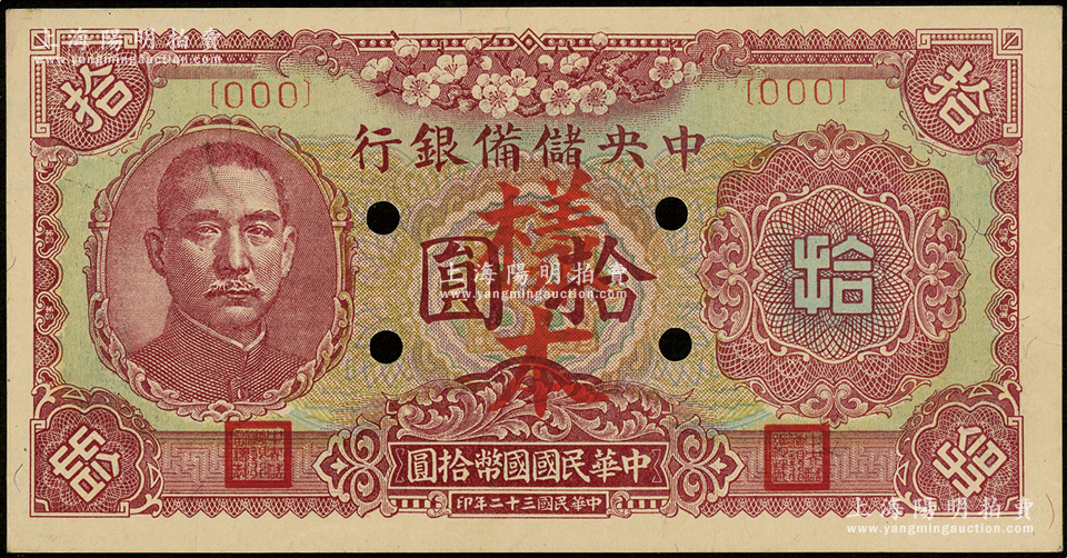 民国三十二年(1943年)中央储备银行梅花版拾圆样本,正背面合印;源于前辈名家之遗藏,九八成新