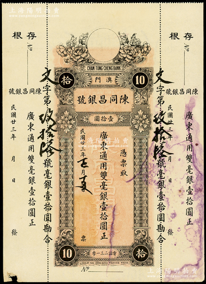 民国廿三年(1934年)澳门·陈同昌银号毫银壹拾圆,内有水印;英国奥斯汀先生藏品,未折八成新