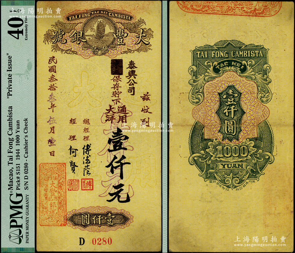 民国叁拾叁年(1944年)澳门·大丰银号通用大洋壹仟元;此大丰银号即为当今澳门著名的大丰银行之前身,票上总经理傅德荫即即澳门第一代赌王傅老榕,经理何贤即澳门特首何厚铧之父,少见,八五成新