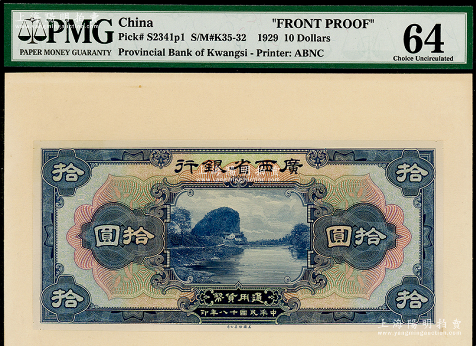 民国十八年(1929年)广西省银行拾圆试印样本券,正背共2枚,张贴于美国钞票公司档案卡纸之上,雕刻版手感强烈;海外藏家出品,全新