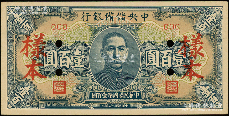 民国三十二年(1943年)中央储备银行蓝色短号券壹百圆样本,正背面合印;源于前辈名家之遗藏,九八成新