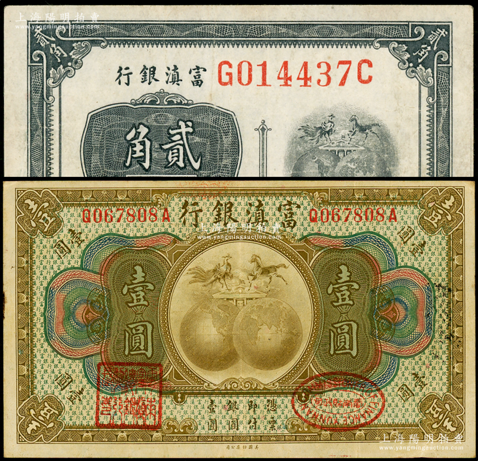 富滇银行(1921年)美钞版贰角、壹圆共2枚不同,海外藏家出品,八至八五成新