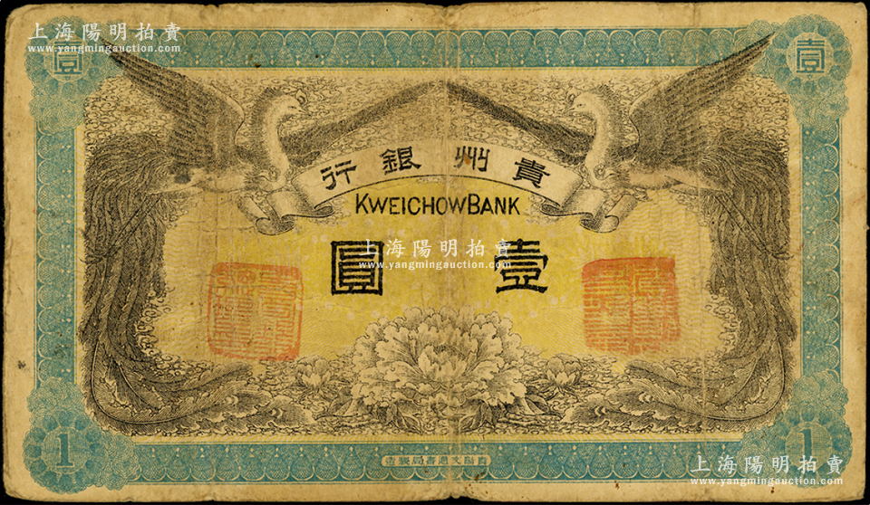 民国元年(1912年)贵州银行双凤图壹圆,其左右职章为“贵州银行总理之印”和“贵州财政司司长之章”(背为“贵州都督之章”),属第一版发行券,少见,原票七成新